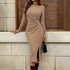 Women's Casual Twist Front Long Sleeve Midi Dress Round Neck Split Hem Bodycon Dresses