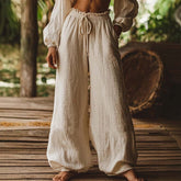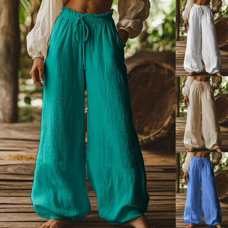 Fashion Casual Loose Artistic Pocket Drawstring Elastic Waist Wide Leg Pants
