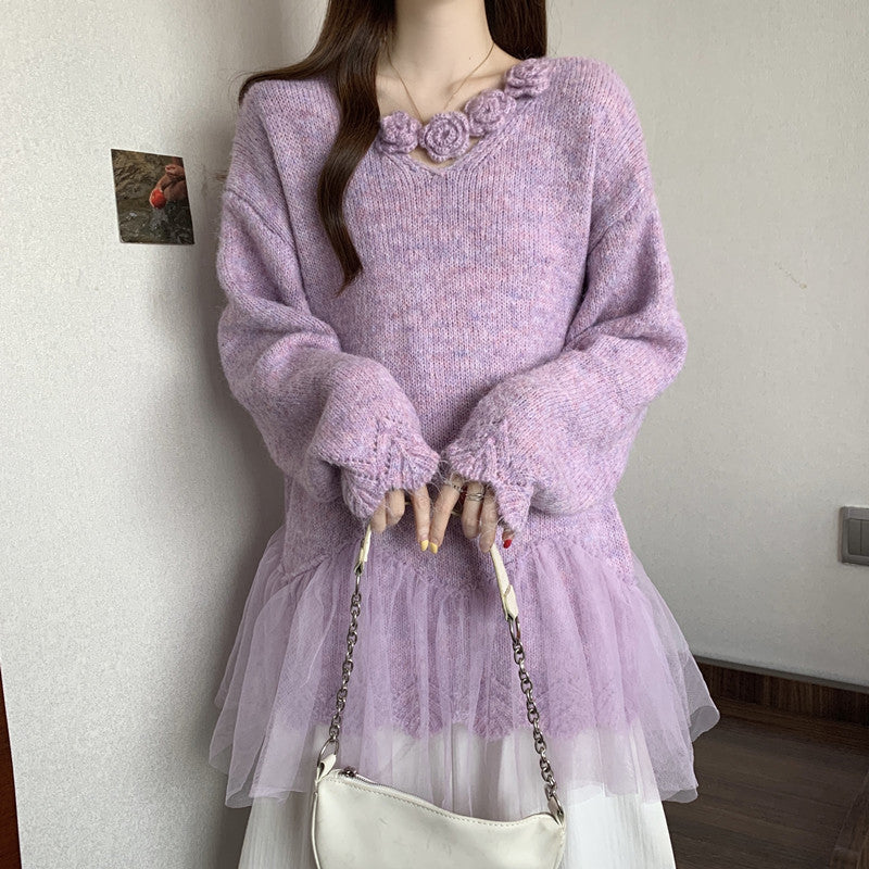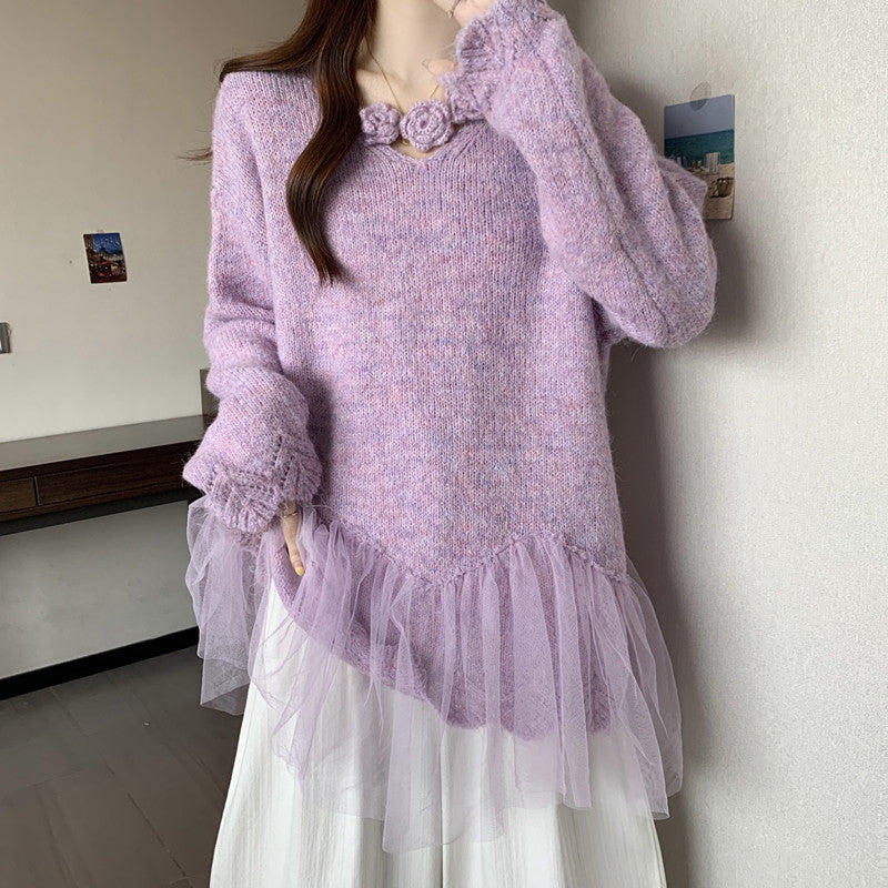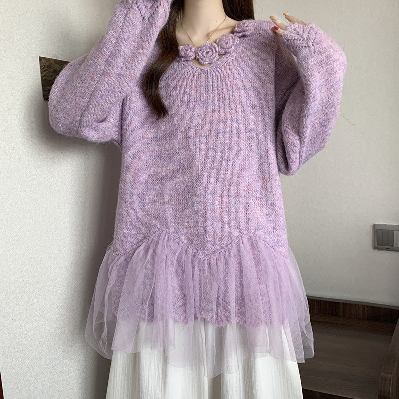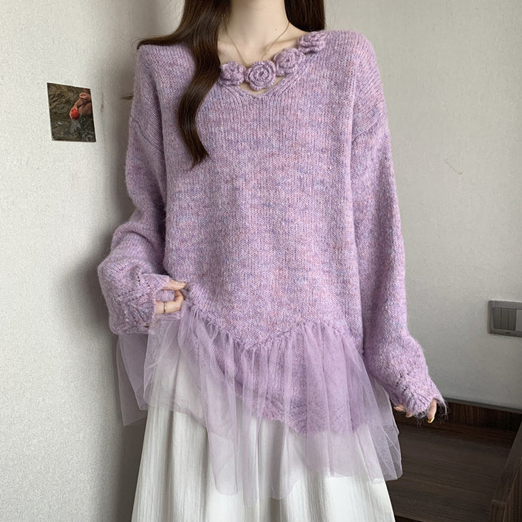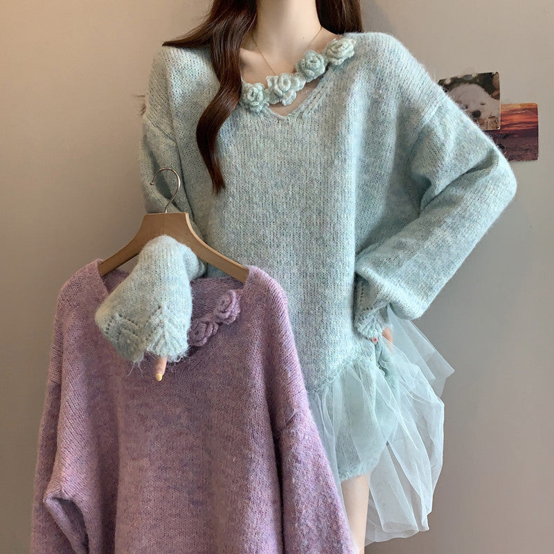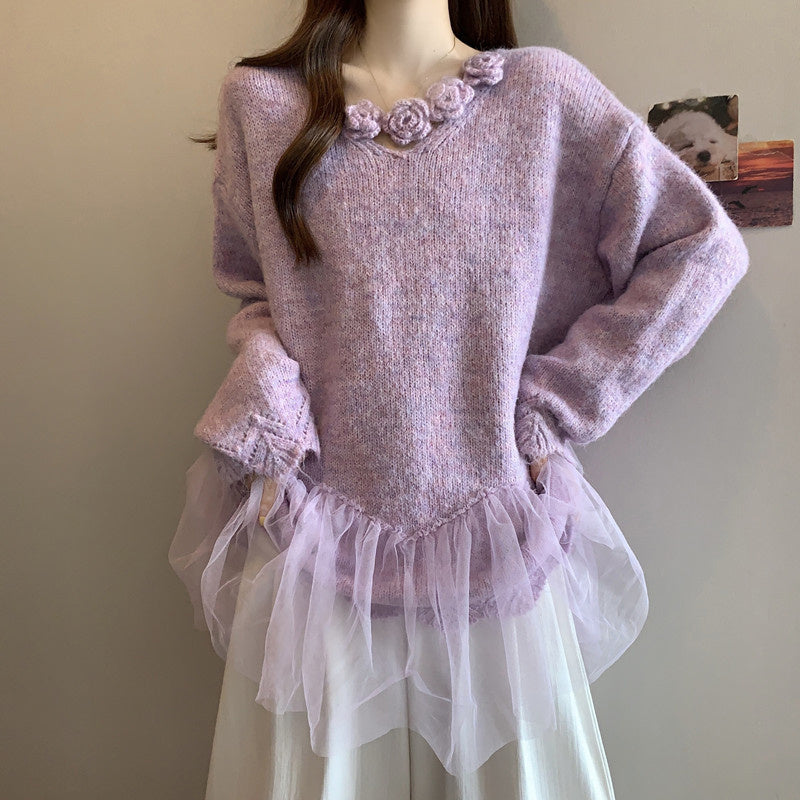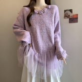 Indulge in luxurious comfort and feminine charm with our Plus Size Floral Lace Trim Sweater. Designed for the modern woman who appreciates delicate details, this long-sleeve top features exquisite attached decorative flowers and a graceful lace trim at the hem , creating a beautifully romantic aesthetic. The soft, eyelet knit fabric offers a subtle texture and a relaxed, slouchy fit that elongates the silhouette, perfect for achieving an effortlessly chic and cozy look during autumn and winter.