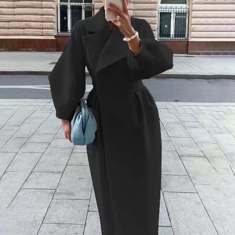 Women's Classic Winter Long Coat, Double-Breasted Belted Trench with Wide Lapel, Solid Color Oversized Overcoat for Casual Style