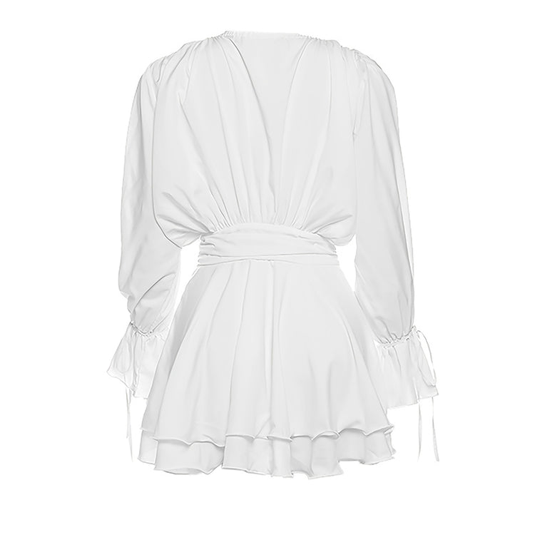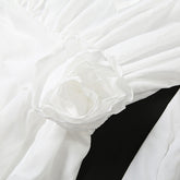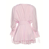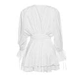 Women's Elegant Solid Color Tie-Neck Dress With Floral Applique, Smocked Sleeves & Tiered Ruffle Hem Boho Mini Dress For Spring Summer